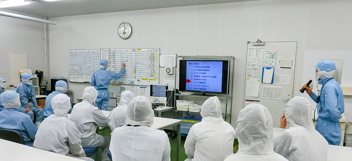 下の画像はセミナーで工場内の昼礼に参加していただいている場面です。