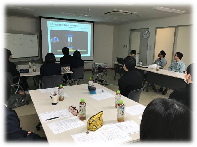 アスカカンパニー内の生産機器やカメラ検査、それらを活用した取り組みなどを説明。