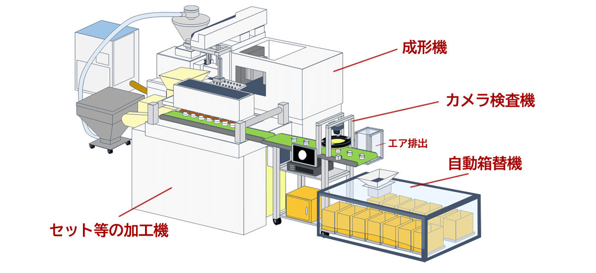 カメラ検査の流れとしては、成形機から製品がとりだされ、コンベア上を流れたきたところをカメラで撮影し、良品と不良品の判定を行い、不良品であればエアーで排出する、といった流れです。