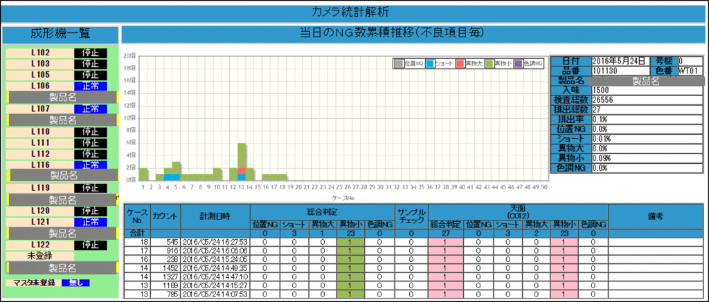 製品毎にカメラデータを集計し、複数ラインのデータを表示してくれますので、これ一つで成形場全体のラインが管理できます。