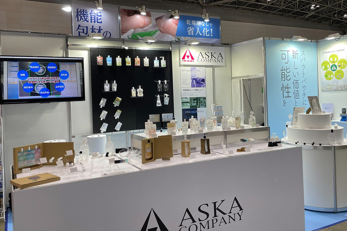 アスカカンパニーではスパウト付パウチ製品を中心に展示しており