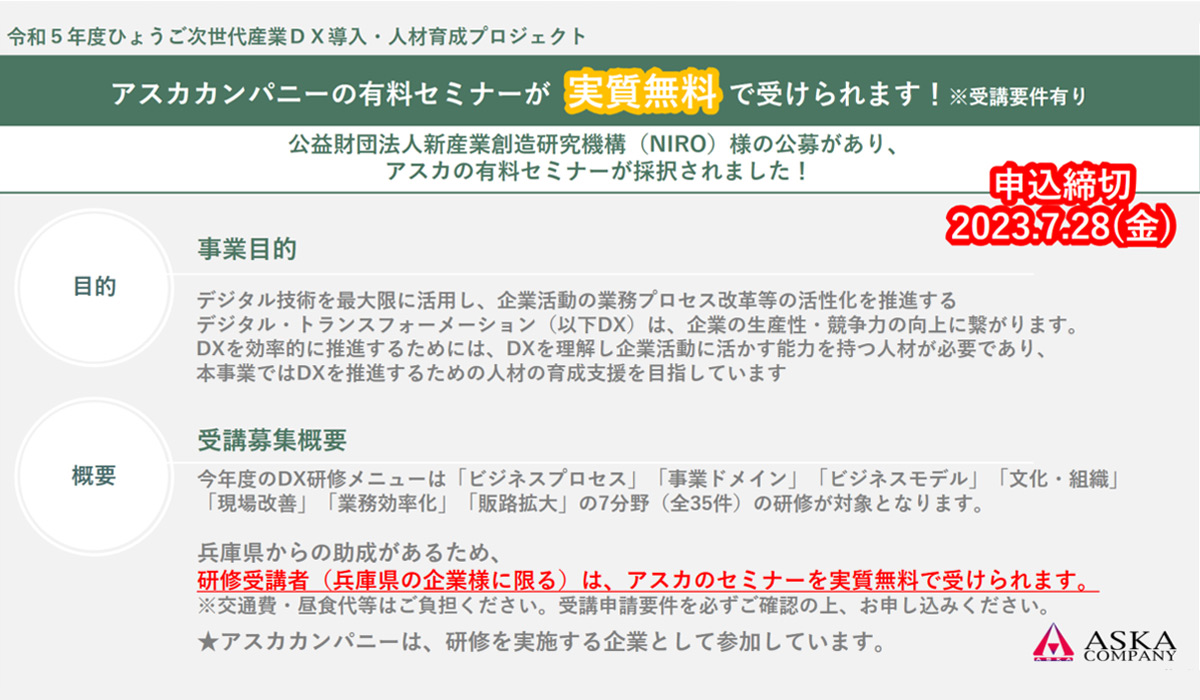 こちらは、DX の取組みを実施または実施予定の対象事業者の方に向けた研修となり、兵庫県の企業様(受講申請の要件をご確認下さい)は、実質無料でセミナーを受講いただくことが可能です。