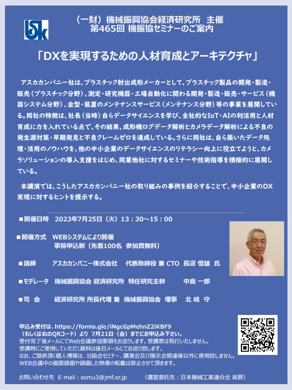 (一財)機械振興協会経済研究所 主催、第465回 機振協セミナーにて、弊社アスカカンパニーのデジタル分野を含む技術を取り仕切るCTO(最高技術責任者)であり情報化学にて博士号を取得した長沼恒雄が登壇します。