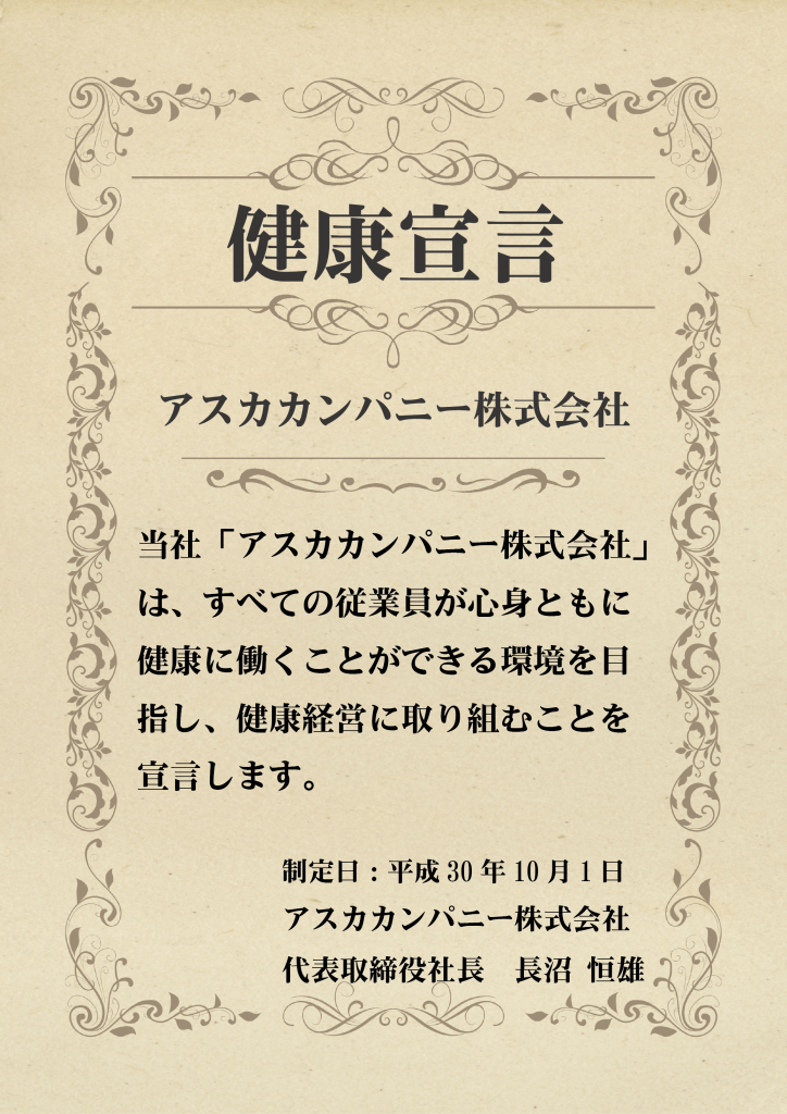アスカは、平成30年10月1日に「わが社の健康宣言」登録企業として認定されました。