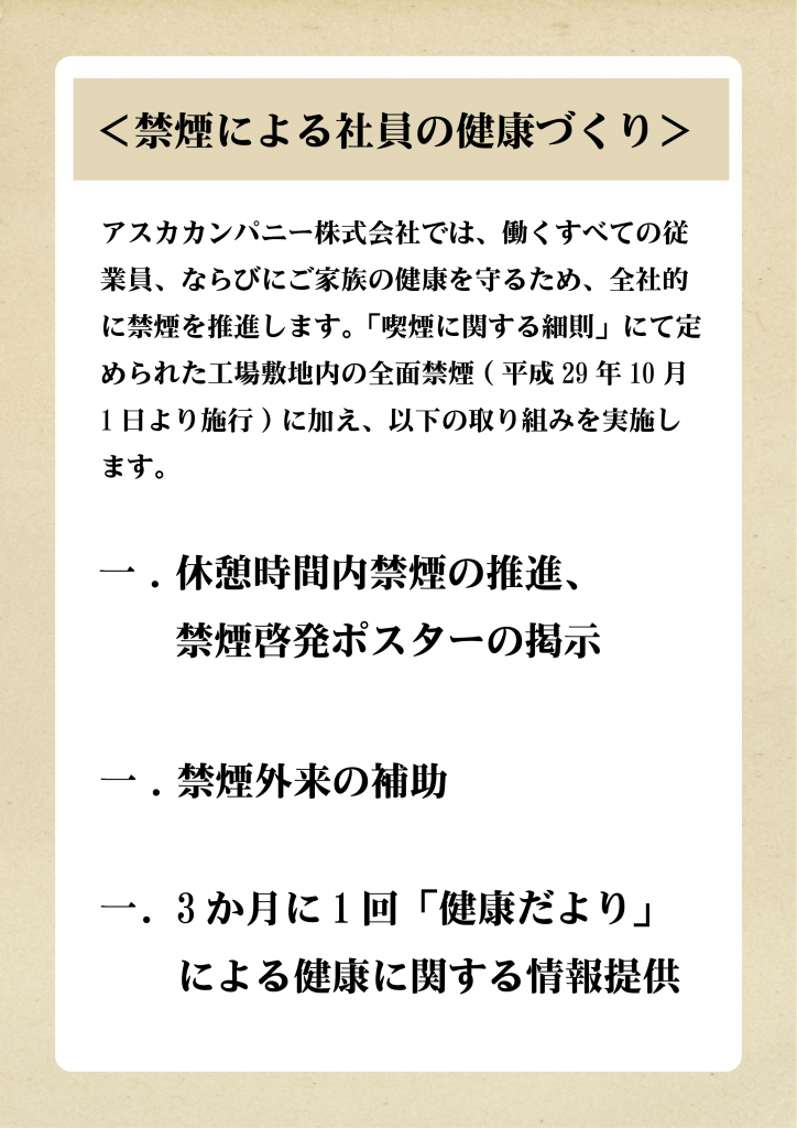 アスカでは、従業員およびご家族の健康を守るため、すでに社有地内の全面禁煙が施行されています。(平成29年10月1日~)