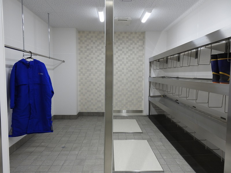 アスカの工場入り口には、長靴の履き替えや、コートをかける専用のエリアを設けています。