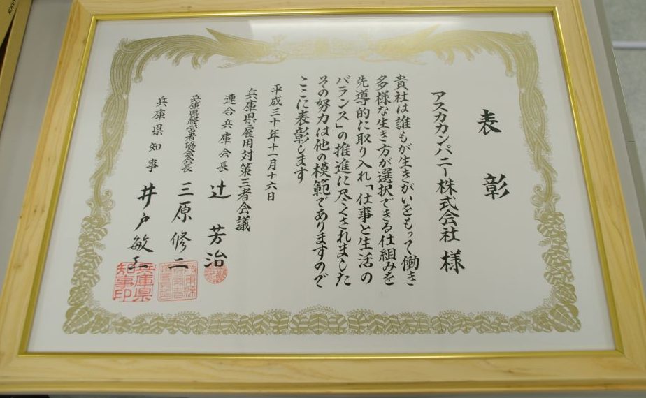 今回の表彰では、アスカを含む兵庫県内の企業計11社が受賞企業として選定されました。