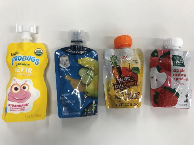 婴儿食品、有机饮料等多使用带嘴的袋子,特别是左端的黄色产品