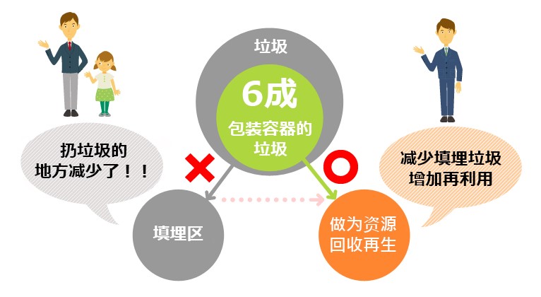 概述:包装容器回收再生法,是制定占家庭排出垃圾总数约6成(体积比例)的包装容器的废弃物再生的制度、以减少垃圾、有效利用资源为目的作成的法律。(1995年制定)