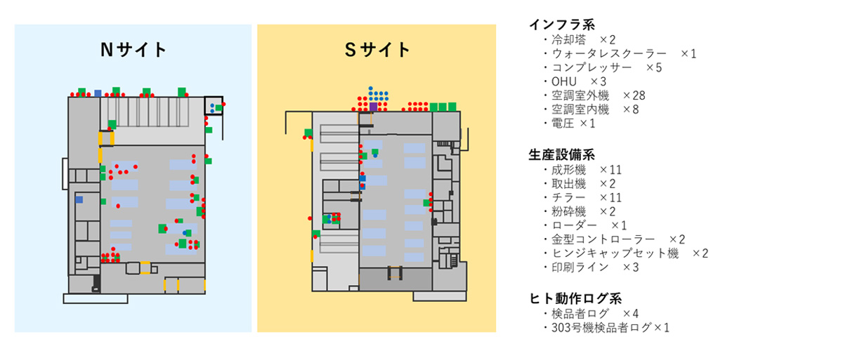 We use various sensors to sense and visualize data on infrastructure systems, production equipment, human movement, temperature, and humidity (environmental systems) for monitoring.