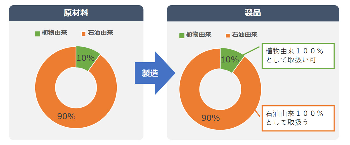 この方式は、既にパーム油、紙製品、電力などの業界では取り入れられており、ある特性を持つ原料の投入量に応じて、生産する製品の一部を「その特性を持つ原料だけで生産した」と見なす手法です。