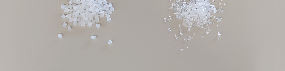 ペレット原料(左)とプレコンシューマ粉砕原料(右)
