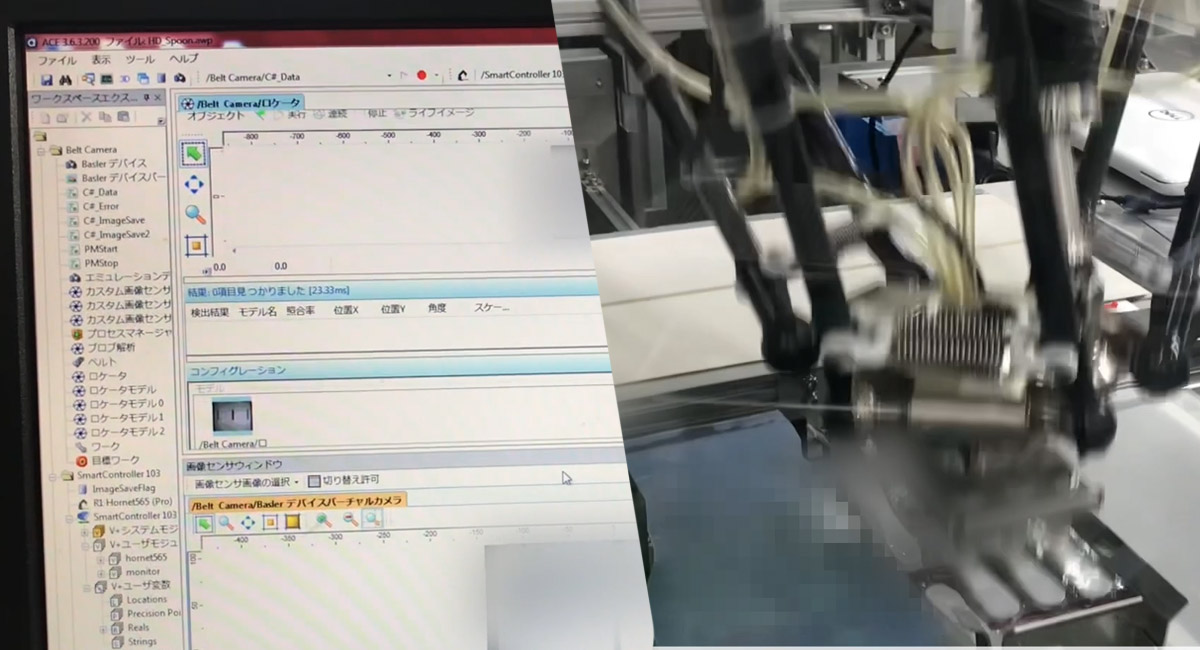 彼の役割は、コンベア上の不確かな位置に流れる4方シール包装されたシートを、画像処理で位置を検出し決められたスタック位置に確実に置いていく動作を行います。