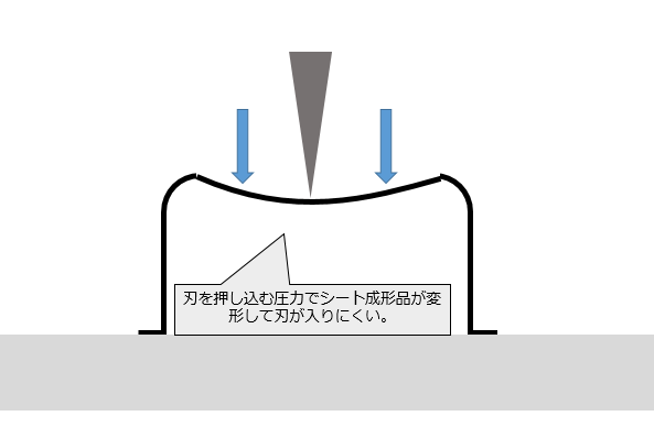 射出成形品は比較的、肉厚なので、刃を当てるときにぐっと刃が入ってくれますが、肉の薄いシート成形品だと刃が入る前に成形品自体が圧力に負けて変形してしまいます。
