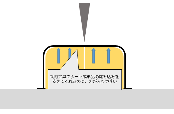 シート成形品を切断する時にひしゃげないようにサポートをしてあげると、切断がうまくいく場合があります。