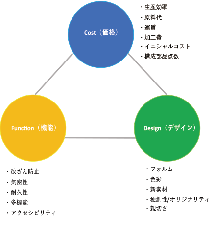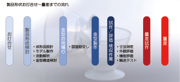 弊社コーディネーターと設計とお客様でキャッチボールを繰り返させていただき、形状のないところから、ご要望の機能を満たした形状を図面化します。そして金型起工から金型完成後、試作を行い、検収完了、量産までを行います。製品開発時には、製品の高付加価値化を目指し、デザイン性・コスト・機能性のいずれの要素も加味できるような製品設計やユーザビリティを最も効果的に発揮する製品を探求してまいります。
