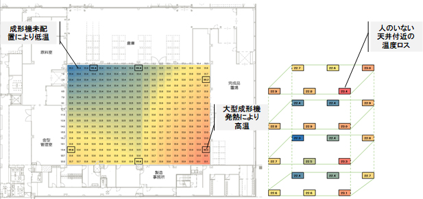 そのほかにナレッジパークではパッケージエアコンが6台稼働する事で成形場内を調温しており、壁面に温度センサーを6か所(1か所あたり:上下4か所)計24か所の温度をセンシングしております。