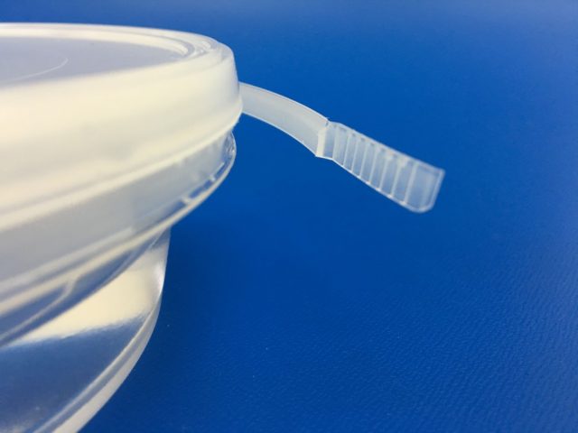弊社は射出成形法を得意としていますので、多くの製品は射出成形をもとに開発し提供しています。ピルファープルーフの一例として医療現場で使用されている弊社が製造する容器があります。蓋と容器本体の2パーツで構成されています。いずれも射出成形法により加工されたものです。この製品をヒントに容器側をシート成形の加工法でアライアンスパートナー企業さまのご協力を得て開発し、試作金型で検証してみました。