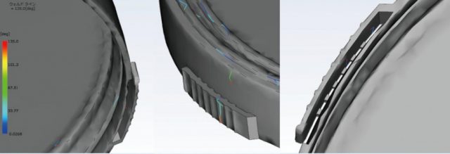 樹脂流動解析をすると、連結部C付近に樹脂の合わせ目となるウエルドラインが細かく見受けられます。