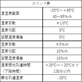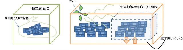 そもそも恒温恒湿とは、「温度、湿度共に一定に保っていることであり、 特に製品試験室などに適用される。しかし非常に難しい空調であり、熱交換形換気機器など使用し、 恒温恒湿している。また、このことを特殊空調とも言われる。」(wikipediaより引用)とありますように、温度や湿度を一定に保った状態で品質にどの程度影響があるのかを測定しています。