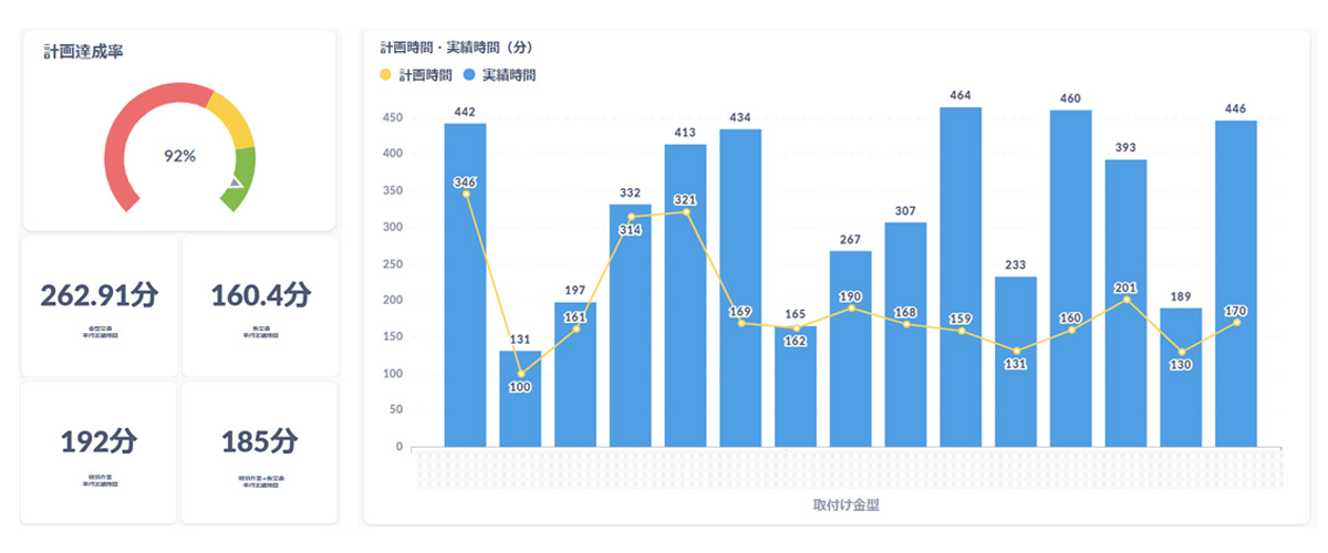 工場別実績では、工場ごとの型替え時間の達成率や各作業にかけた時間を作業分類別で表示しています。