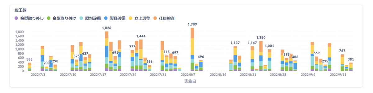 金型別実績では、過去の型替え作業時間を振り返ることで、次回以降の金型交換作業で気を付けるポイントや、時間がかかる作業については、事前に準備しておくことなどの金型特性を掴むことができます。