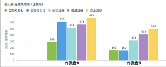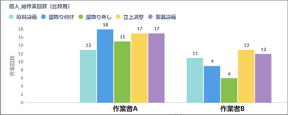 個人実績では、個人の作業回数や作業時間はもちろんのこと、個人間の比較も行えます。