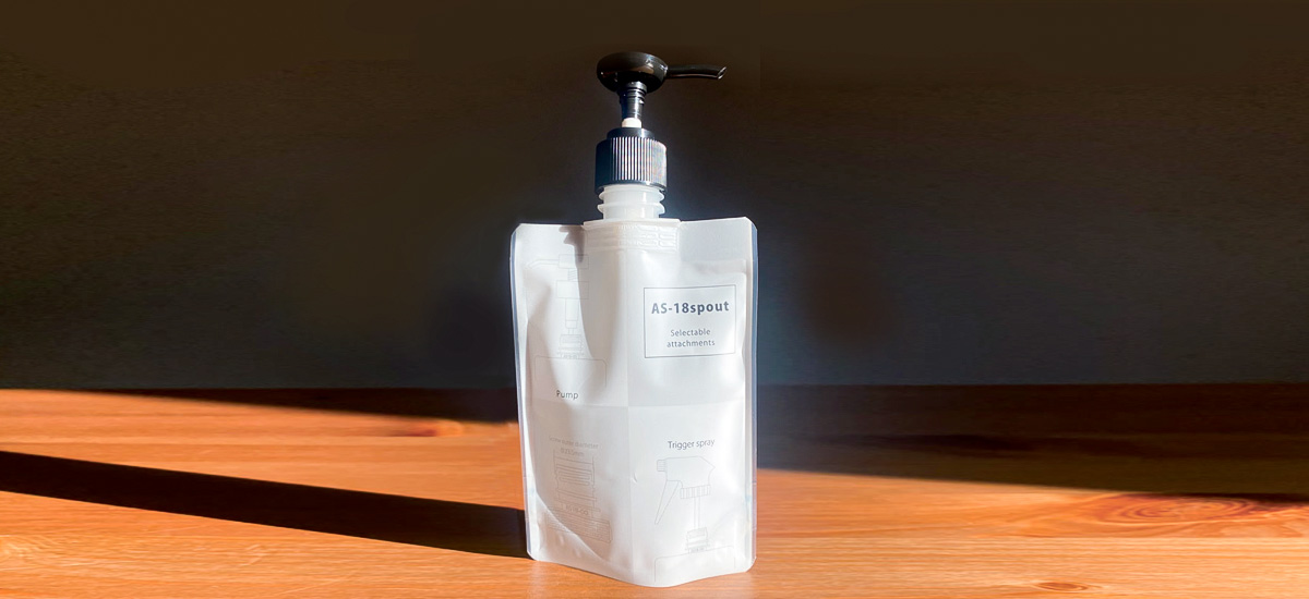 この製品は、従来の「詰め替え」用途としてボトルへのリフィル容器として使用されてきたスパウト付きパウチ