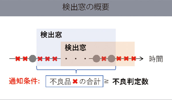 その設定方法は『検出窓と呼ばれる一定の期間内に、何個不良があったのか』という形で設定します。