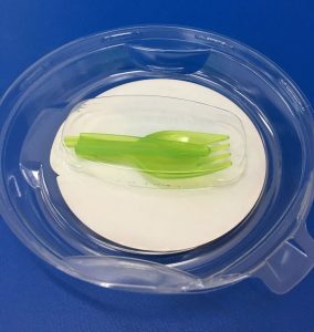 イラストには小さく「フォークがついています」とデザインされています。でも買って初めてフォークが貼付されているのがわかるくらいです。蓋をひっくり返すと半透明の黄緑色の折り畳みフォークが見えます。上のシールをはがすと取り出せます。この容器とは別に白い折り畳みのフォークも発見しています。日本より折り畳みが好きなお国柄なのでしょうか?アスカの開発したのびーるスプーンは、新ビオフェルミンS細粒にご採用いただいています。