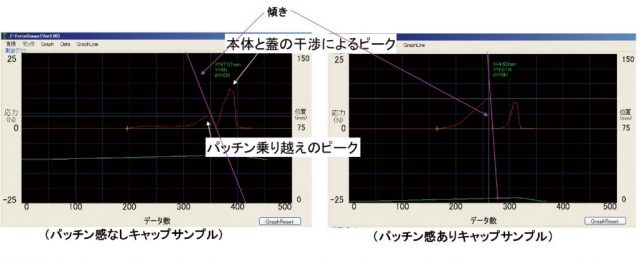 パッチン感のないキャップはパッチン乗り込えピークの到達強度が弱く、またパッチン乗り越えピーク後のグラフの傾きがなだらかな為、パッチンという音が鳴りません。