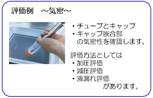 きちんと気密が保たれているかどうか評価するために加圧試験・減圧 試験・液漏れ試験という方法があり、製品によって評価方法を使い分けます。