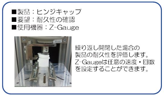 →上蓋を開くときには硬すぎても軟らかすぎてもいけません。決められた強度の規格内におさまっているかどうかを評価します。Z-Gaugeは任意の速度が設定できるので誰もが同じように評価でき、数値化したデータが得られます。
