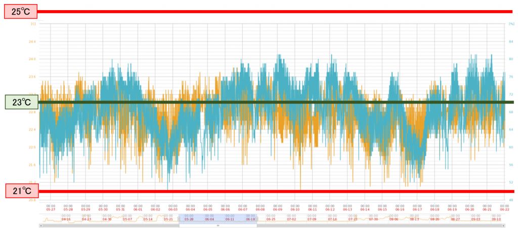 そもそも恒温恒湿とは、「温度、湿度共に一定に保っていることであり、 特に製品試験室などに適用される。しかし非常に難しい空調であり、熱交換形換気機器など使用し、恒温恒湿している。また、このことを特殊空調とも言われる。」(wikipediaより引用)とありますように、温度や湿度を一定に保った状態で品質にどの程度影響があるのかを測定しています。