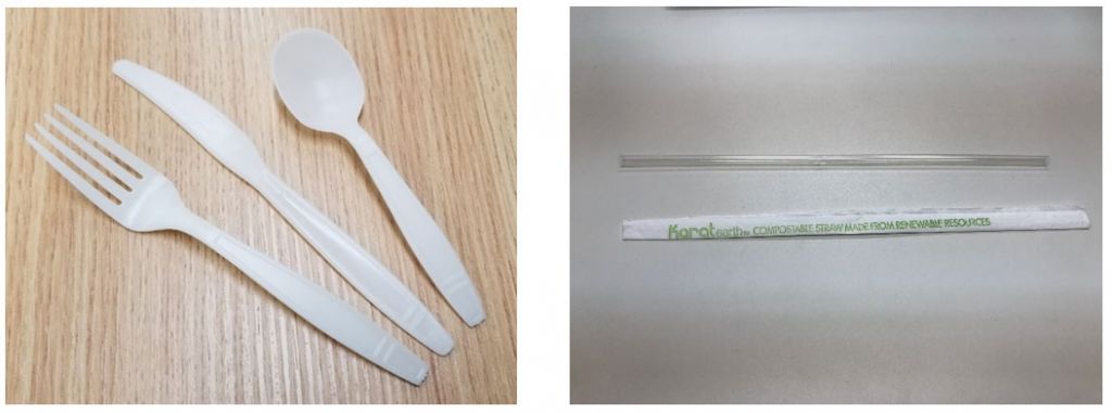 スプーン、フォーク、ナイフはすべて環境対応されたものになっており、ストローは紙ストローではなく、”COMPOSTABLE STRAW MADE FROM RENEWABLE RESOURCES”と表記されています。