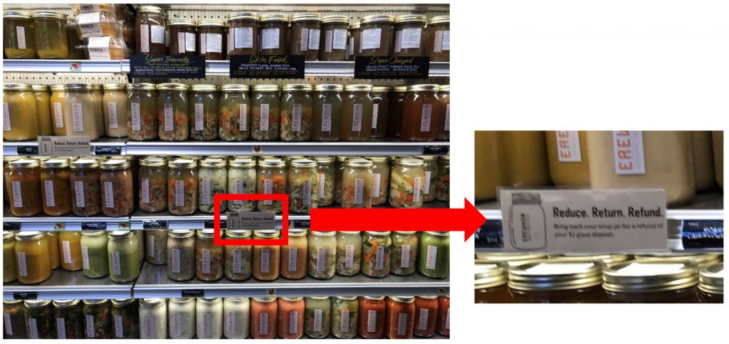 その他にも店内で作られたようなスープが瓶にはいって販売されているのですが、写真を見ていただくとわかるように、使用後に瓶をお店に返すと$2返ってくると表記されていました。
