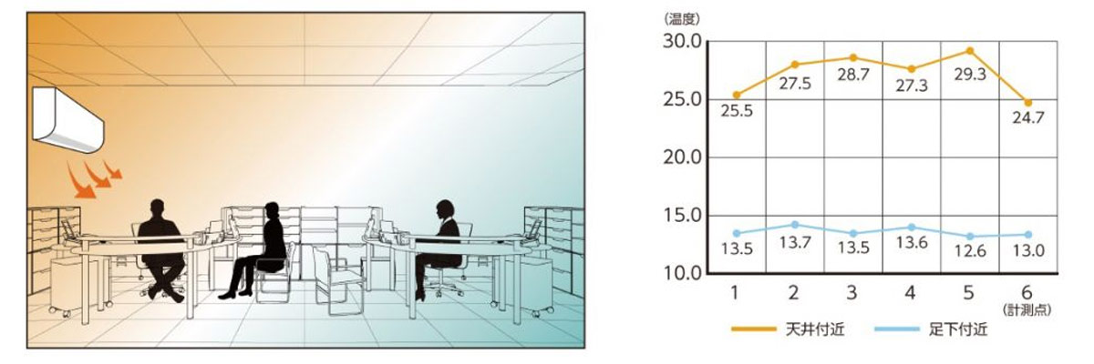 天井付近には熱だまりができる一方で足元は寒いまま!