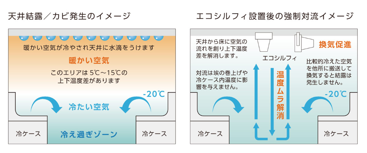 エコシルフィとは、空調効率をアップさせる本体から直線的な風によって誘導される「強制対流」が天井から床に向けて心地よい風が吹き出されます。「強制対流」により室内の温度ムラを解消し、オフィスやご家庭の快適な空間を実現します。