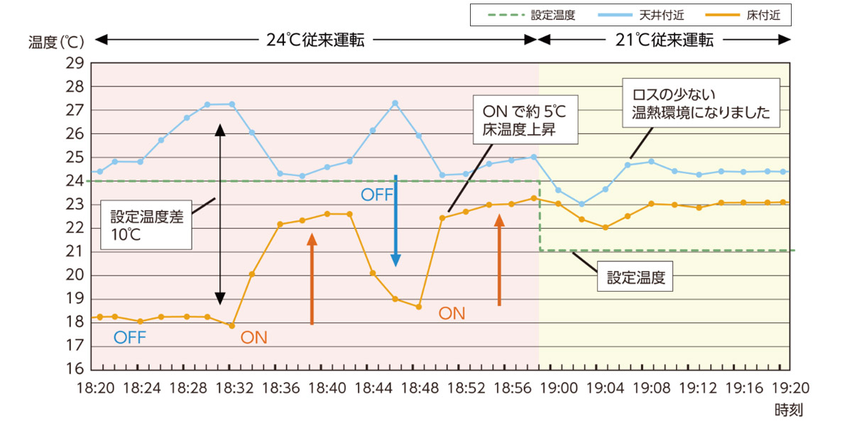空調設定温度を3℃下げても、従来(OFF時)より床温度は約5℃暖かいままでした。