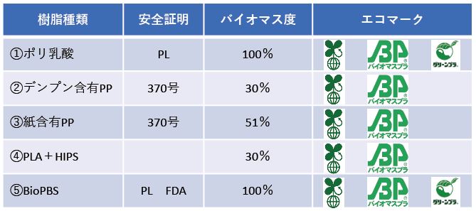 | ① | ポリ乳酸 | 透明 | 〇 | ✕ | - |