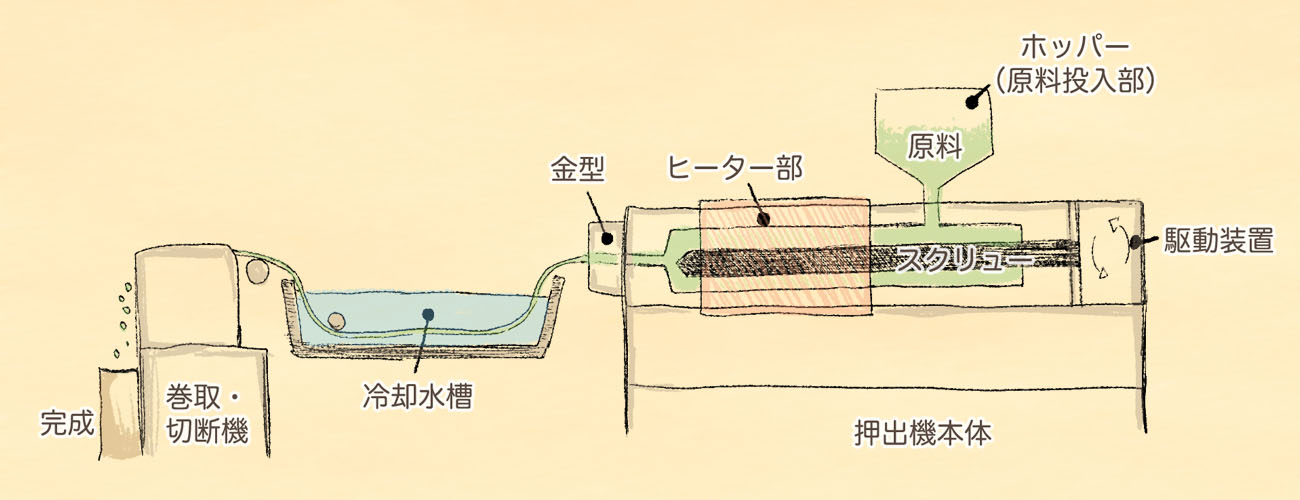 成形機の仲間ですが、熱された樹脂が金型から細長く押し出されて出てくる仕組みになっています。