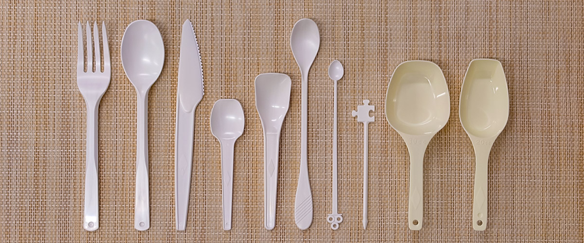 こちらが実際に生産されているプラスチックカトラリーの一部です。