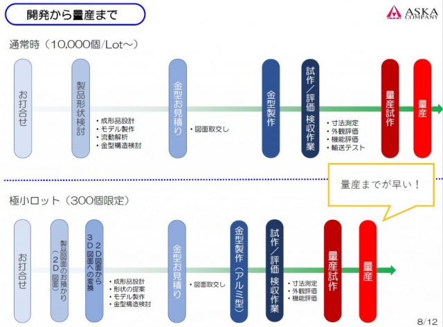 アスカカンパニーの小ロット製品対応は開発プロセスから小ロットを見越して開発させていただきます。