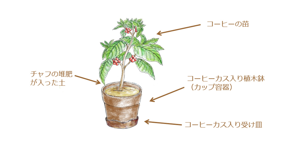 コーヒーカスが堆肥として入ってる土に植えられた、コーヒーの苗。それらを支えている植木鉢と受け皿には、コーヒーカスが入っていて、ほんのりコーヒーの香りが楽しめます。