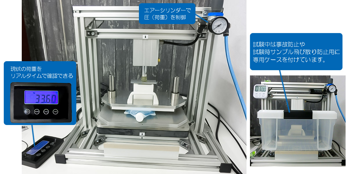 耐圧縮試験は内容物を入れて行う試験のため実使用に近い条件で試験を行うことが可能です。