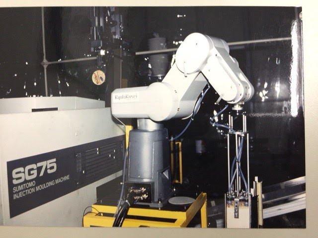 下の写真は20年ほど前に初めて開発を終え、生産としてインモールド成形を始めた時のインサート機の写真です。