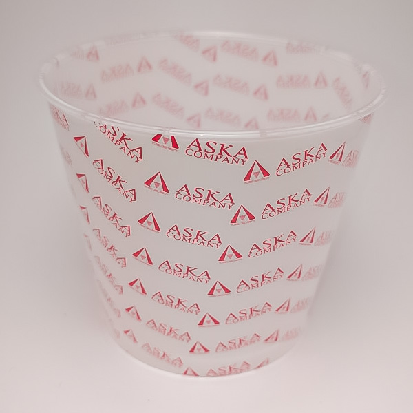 アスカカンパニーのロゴを使用したインモールドラベルを使用して、プラスチックカップへのインモールド表現のサンプルを作成してみました。