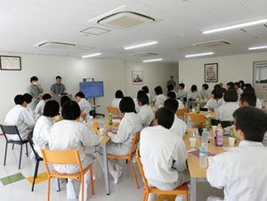 3班に分かれて実際にSサイト・Nサイト工場を2Fから見学していただいたあと、弊社製品が使われているプッチンプリンを食べながら働くことについての講話を聞いていただきました。