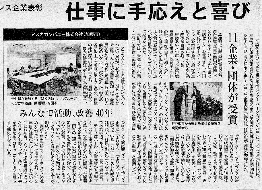 本日11月27日(火)の神戸新聞朝刊にて、先日の「ひょうご仕事と生活のバランス企業表彰」についての記事が掲載されました。
