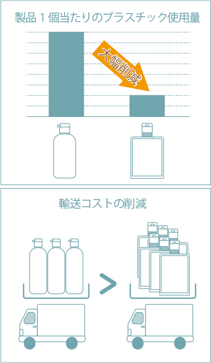 特别是对于塑料环境问题,我们发现,用瓶装容器和吸嘴袋制造相同内容量的容器时,吸嘴袋的树脂使用量约为瓶装容器的一半。因此,与减少塑料有关的吸嘴袋可以说是对环境友好的容器。